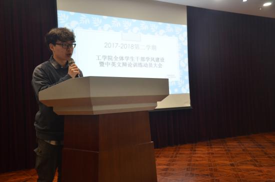 2018年3月20日在昇华楼四楼小剧场举行2017-2018第二学期工学院全体学生干部学风建设暨中英文辩论训练动员大会。参加本次会议的领导老师有工学院党总支书记赵科、党总支副书记金玫和各辅导员。