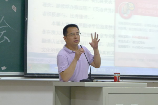 | 2013年6月5日,英语系举行我院第四届“英语世界”杯翻译竞赛参赛动员大会,大会由英语系万正方教授主持,学院副院长、英语系常务副主任史文博士到会作动员报告,全院有100余名学生与会参加竞赛,英语系学生代表胡珊珊和孟博上台发言。在今后的一个月中,英语系青年教师和参赛学生将围绕参赛原文研讨翻译问题,争取在又一个全国性的翻译赛事中以良好的成绩回报天华。(英语系 杨燕玲) | ||