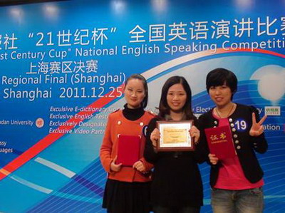2011年12月25日,我院英语系2010级梁欣媛、2009级付雪楠在指导老师胡雅楠、史媛的带领下参加第十七届“21世纪杯”全国英语演讲上海赛区比赛,荣获三等奖。天华学院荣获中国区选拔赛“最佳组织奖”。