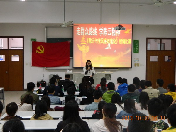 | 2013年10月30日下午,我校工学院组织的“走群众路线,学陈云精神”红色经典朗诵比赛在日阶103举行。校党委书记韩晓玉,工学院党总支书记刘香连,副书记王慧荣、赵科,工学院通信工程专业党支部书记金玫以及各班辅导员参加比赛。12级汽服1班江萧同学担任主持。 工学院党总支副书记赵科为比赛致开场词,表达了对校党委韩书记百忙之中莅临比赛现场的感谢,强调走群众路线、学陈云精神要从身边事情做起。比赛以对有关陈云同志作品的诵读为主,并辅以其他艺术表现形式,参赛通过乐器伴奏、男女和声、配以毛笔书法展示等等多种形式,表达对陈云精神的敬佩,比赛气氛激烈,场下观众兴致勃勃,紧张而有序的比赛持续了将近一个小时。 最终,经过评委老师的艰难选择,工学院党员工作站事务部乌宇哲同学的《您的精神活在心中》获得第一名;策划部王梓秋同学的《陈云颂》,检查部周敏、黄旭东组合的《陈云精神》获得第二名;学习部杨雅芸同学的《江南史诗》(陈云篇),策划部韦亚平同学的《陈云颂》,检查部储兆奎、周传健组合的《陈云精神》获得第三名。 活动最后,工学院党总支书记刘香连总结讲话,指出本次大赛选手们表现非凡,组织有序,希望全体党员同志们能够通过此次“走群众路线,学陈云精神”系列活动不忘继续学习陈云优秀事迹,发扬陈云精神,走群众路线,服务群众。 | ||
