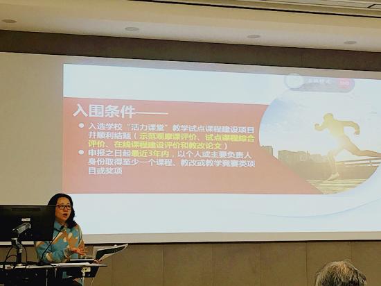 副校长龚春蕾首先围绕星级教师的入围条件、评审要求、时间安排等方面对整个认定流程作了详细解读。此次认定,对入围教师的 “活力课堂”教学改革试点课程建设项目达标情况,和教师所获省部级课程、教改或教学竞赛类项目或奖项都有明确的规定。经教师个人申请,二级学院推荐,按入围条件审核后,进入评审环节。教师需要完成现场授课、说课、课程改革情况整体汇报等环节,并提交课程建设成果汇编、在线课程运行报告、教改论文、学生真实性学习成果等相关佐证材料。学校将组织以校外专家为主的专家评审组,对教师教学目标的达成度、教学设计的创新度、教学实施的活力度,以及教学评价的满意度,进行全面验收考核,确保认定的权威性、科学性和公平性。随后,龚副校长展示了此次认定的相关评价体系,希望老师们能积极申报,并对照各项评价指标,按照时间节点做好准备工作。