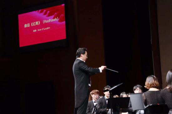 18:00 音乐会在万众期待下开始了音乐会的开场由一首《红鹰》拉开帷幕。白雪皑皑,雄鹰高飞。简单的节奏型、雄壮亮丽的旋律,坚定、勇敢的主基调呼之欲出。铜管的辉煌音色、打击乐器充满力量和希望的强奏,都是本首曲目的亮点。
