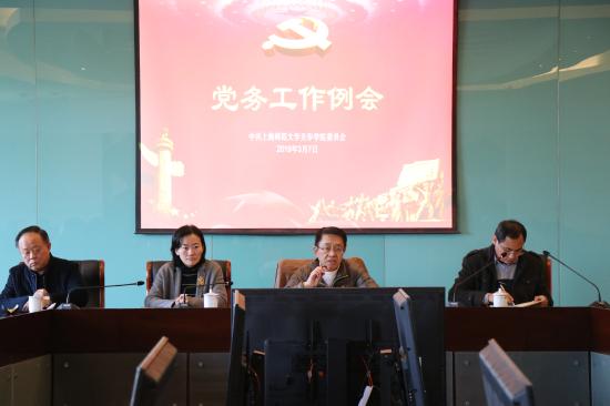 为学习落实全市高校党的建设会议精神以及对党的建设提出的新任务、新要求,开创新时代基层党建新局面,我校于2019年3月7日下午13:30,在明华楼五楼会议中心召开2018-2019学年第二学期党务工作例会,党委书记陆建非,副书记曹云林、许岳,党委委员陈新斌、齐砚奎、周凯波以及各基层党总支正副书记,组织员、宣传员、纪检员参加会议。会议由党办主任、宣传部长齐砚奎主持。