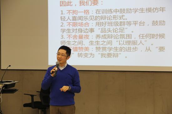 此次培训以“辩论与育人”为主题,聂晓晶老师从“培养学生成为具有国际视野的合格公民”为出发点,围绕辩论训练的目标、辩论习惯的养成、辩论技巧的提升和常见的逻辑问题四个方面,同在座所有老师探讨了辩论训练工作。同时指出天华学子应该通过辩论训练得到以下五个方面提升,即:表达能力,思辨能力,运用能力,应变能力和协作能力;最后希望参与辩论训练工作的每位老师通过指导学生辩论,成为指明目标的领航员、塑造习惯的指导员和实战演练的裁判员。