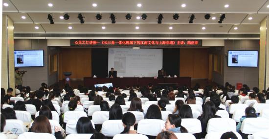 2019年3月29日下午13:00,本学期首讲“心灵之灯”系列讲座之《长三角一体化视域下的江南文化与上海非遗》在晖华楼报告厅顺利举行,校党委书记陆建非教授为广大师生带来一场精彩的讲座,学保处副处长、校团委书记包静波主持本次讲座,学保处助理以上干部、各二级学院党总支书记、全体正副辅导员以及各学院300余名学生聆听了此次报告。