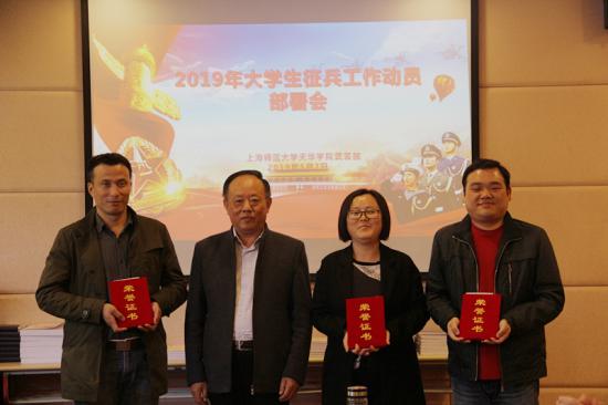然后,校武装部通报表彰了2018年征兵工作先进学院,分别是管理学院、工学院和艺术设计学院,并颁发了奖状。