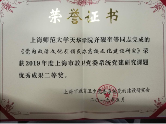 5月23日,上海市教卫党委系统党建研究会召开2019年年会,表彰了2018年党建研究课题优秀成果,并下发了2019年党建重点课题立项通知书,我校2项党建研究课题获得优秀成果表彰。其中,齐砚奎同志承担的《党内政治文化引领民办高校文化建设研究》获二等奖,康淼同志承担的《加强民办高校党外青年教师思想政治教育研究》获三等奖。