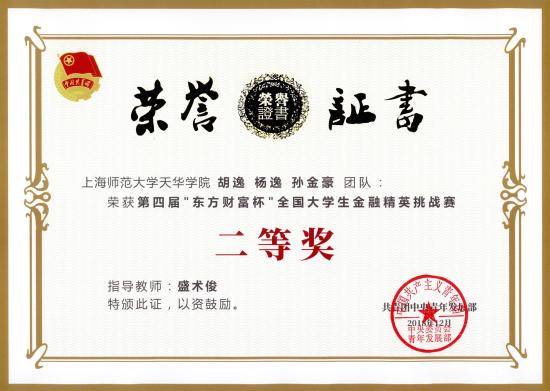 在翁跃明处长(管理学院副院长)的精心组织下,经过校赛、省赛的激烈比拼,我校管理学院金融数学专业胡逸、孙金豪、杨逸同学,在盛术俊老师的指导下,获得全国二等奖的出色成绩。