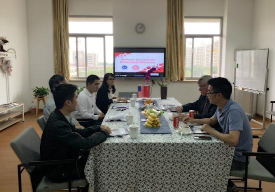 继美国伊利诺伊州立大学分管教学的副校长兼教务长一行4月来访我校、签订两校金融数学专业合作协议后,2019年5月30日该校数学系主任George Seelinger与教师代表Xu Maochao应邀来访,校长叶才福、国际交流处处长胡珍、科研处处长兼管理学院副院长翁跃明、国际交流处副处长梁杰、助理夏智源及金融数学专业教师程成、胡煜中热情接待。