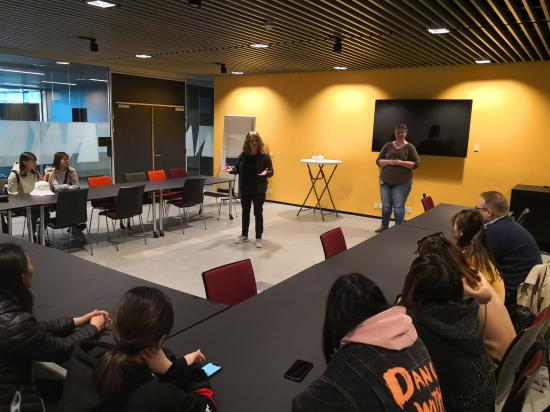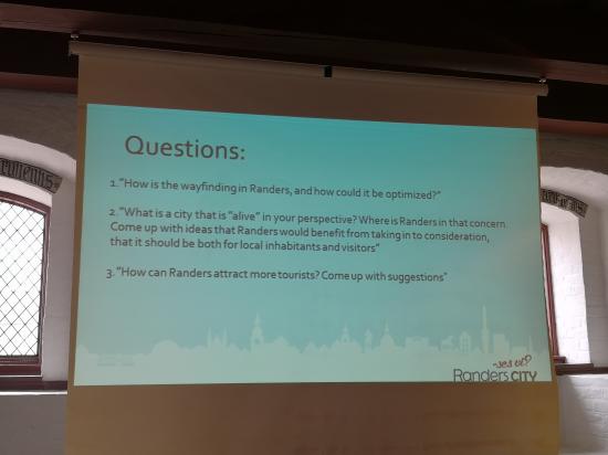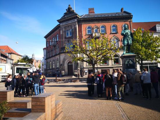 为了促进文化融合与思维碰撞,交流期间达尼亚学院组织了一次实地项目式学习活动。教师将访问团的学生与该校旅游专业约四十位丹麦及欧洲其它国家的学生交叉分成三组,在当地志愿讲解员的引导下步行游览学校所在小镇Randers,之后由当地旅游局工作人员介绍该镇旅游发展概况、布置课题,随后各组带着课题探索小镇,并就当地发展提供建议。