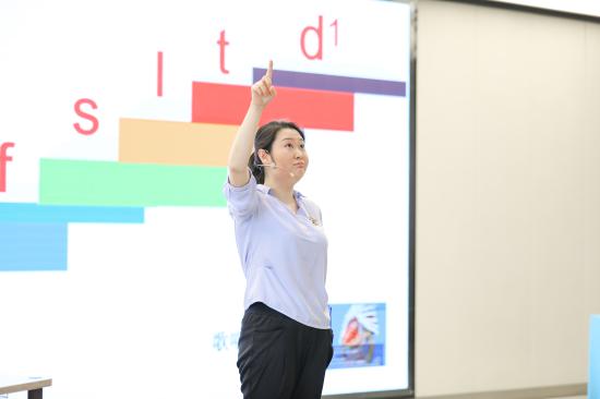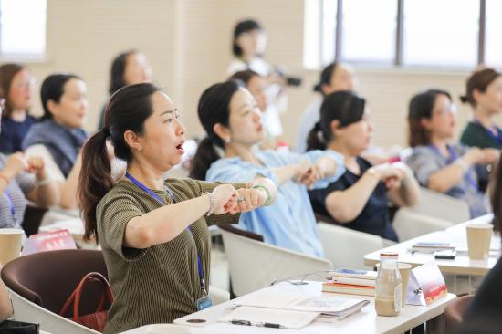 “小艺思”工作坊由学前教育学院向宏兴老师为学员带来《幼儿歌曲的选择与教唱》。向老师以一曲问候歌跟园长们互动认识后,简单直观介绍了3-6岁儿童音乐发展规律和认知特点,介绍了人类歌唱“乐器”的构造。随后,向老师用音乐游戏的方式,少量使用奥尔夫乐器,借助拍手、跺脚、拍腿、振臂等身体律动,同时课程中融入了柯达伊教学法的理念,使用稳定节拍、音阶阶梯、符干记谱法(stick notation)等,带学员体验了节奏、音高,二声部、三声部的变化,随着音乐活动的丰富,最终呈现出一首大家耳熟能详的英文儿童歌曲。整个课程深入浅出,由点到面到体,立体显示了声乐教学的科学性和儿童音乐教学的趣味性。向老师通过精妙的课程设计向研修班的学员们展示了一堂精彩绝伦的工作坊课程。