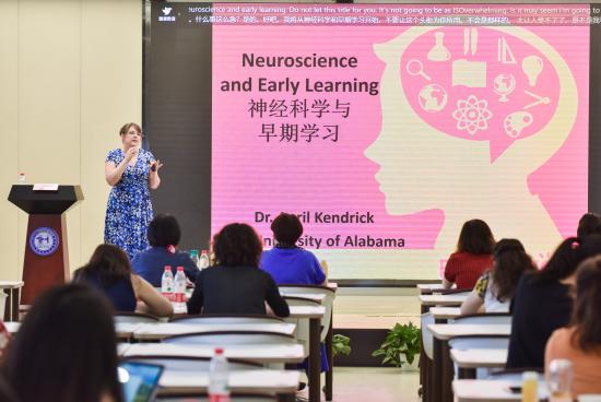 7月12日,来自美国阿拉巴马大学儿童研究与发展中心主任April Kendrick博士为上海市幼儿园园长研修班全体学员作题为《脑科学与早期学习》的报告,报告于天华学院图书馆四楼多功能报告厅举行,张云老师翻译。