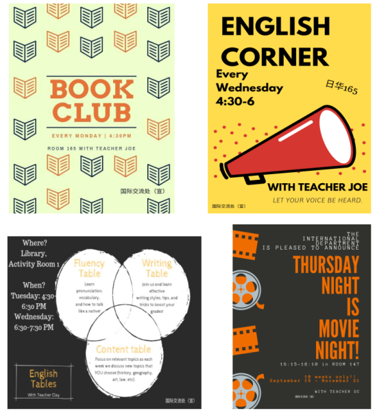 除了生动活泼的英语角活动之外,本学期国际交流处还邀请外教主办了“英语电影之夜”(English Movie Night)、“英语圆桌”(English Table)、“英语悦读”(Book Club)以及“绘声绘演”(Tell and Show)等五项“第二课堂”英语学习活动。