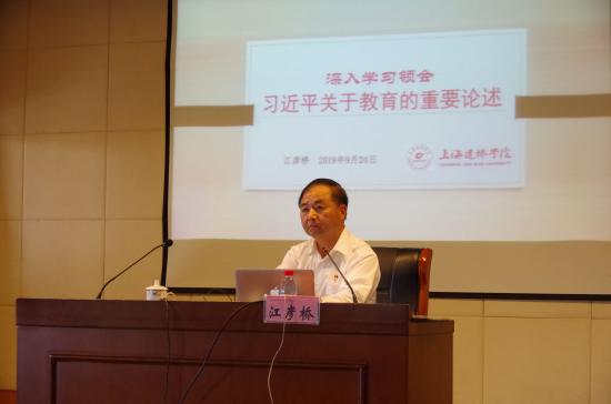 9月24日下午,我校在明华楼五楼报告厅举行“不忘初心、牢记使命”主题教育报告会,特邀上海民办高校党委书记主题教育宣讲团成员、上海建桥学院党委书记江彦桥主讲“深入学习贯彻习近平总书记关于教育的重要论述”,报告会由校党委书记陆建非主持。上海市委主题教育指导组第13小组组长黄小路、联络员沈仕芳,市教卫工作党委第3指导组朱南勤、何斌、尤丽芬、沈洋,市民办高校党工委副书记王庆出席会议。学校校务委员会领导、二级院(系)负责人、助理及以上干部、党总支委员、党支部委员以及部分党员代表参加了此次报告会。由落户我校的上海民办高校干部和党员研修基地承办的,上海民办高校党支部书记“不忘初心、牢记使命”主题教育示范班的30名学员也同步参加会议。