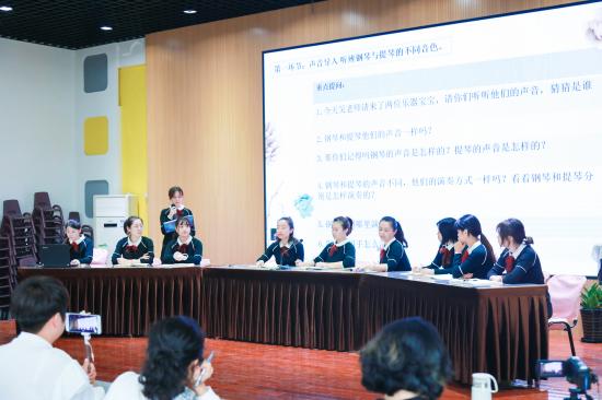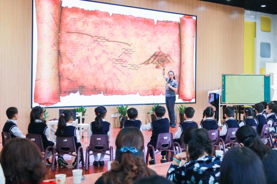 现场展示活动由陈伯吹幼儿园陈铿副园长主持,首先展示了两个集体活动:一个是大班音乐欣赏活动《探寻宝藏》。选用柴可夫斯基《意大利随想曲》片段,执教老师带领孩子们从观察一张藏宝图开始,通过聆听音乐,引发幼儿自主的发现了音乐的走向和变化的不同,结合故事情境来引发幼儿感受音乐,描述音乐,最后通过肢体来表现音乐。