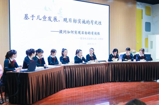 之后,幼儿园小班教研组向大家展示了一次常态教研活动,主题是“基于儿童发展,观目标实施的有效性——提问如何实现目标的有效性”。老带新的教研氛围浓厚,老师们在教研过程中积极互动,骨干教师、青年教师之间能够不断地碰撞出智慧的火花。在交流互动环节,学员们就教研活动研讨框架如何形成,教研问题如何确定等提出了自己的困惑。教研组长是燕老师代表团队,作了题为《聚焦“真”问题——谈教研活动的有效设计》的交流发言,为学员们答疑解惑。