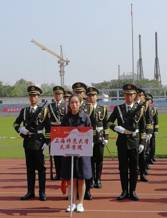 我校由国防军训科科长刘庆奇带队、上海师范大学天华学院国旗护卫班班组成的参赛队以良好的精神风貌,严整的军容,整齐划一的动作,完整的战术编排,赢得阵阵喝彩,给观众留下了深刻的印象。