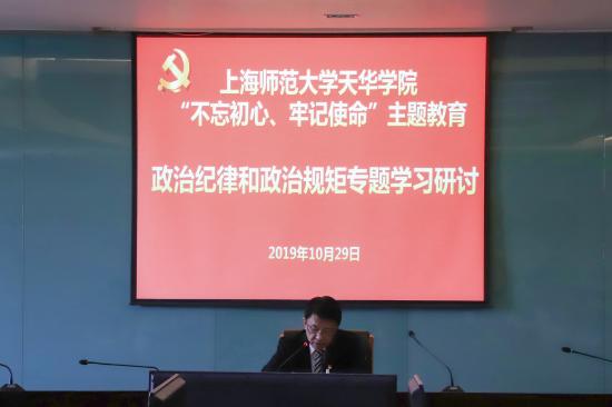 10月29日中午,上海师范大学天华学院开展“不忘初心、牢记使命”主题教育“政治纪律和政治规矩”专题学习研讨,加强纪律教育,强化纪律执行。校党委书记陆建非主持会议并发言,学校党委委员,各二级学院党总支书记参加会议。