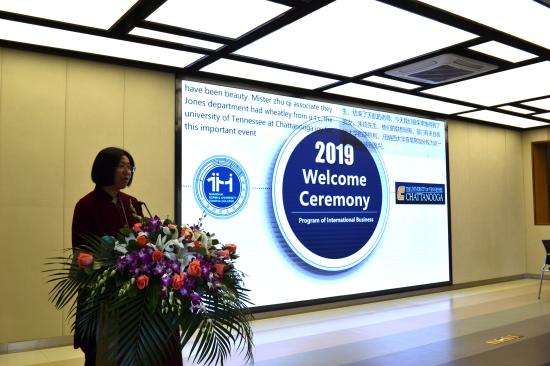 2019年11月19日,田纳西大学查塔努加分校(The University of Tennessee at Chattanooga)来访我校,就两校合作深入商洽,并隆重举办2019级国际商务 专业(国际课程合作)开班仪式。田纳西大学查塔努加分校商学院院长Robert Dooley、副院长Michael Jones、系主任Kathleen K. Wheatley和国际教育中心主任Takeo Suzuki与50名国际商务 (国际课程合作) 专业新生见面。我校商学院院长程葆青、国际交流处处长胡珍及国际商务专业(国际课程合作)负责人孙艳艳出席仪式。仪式由商学院国际商务专业薛翊老师主持。