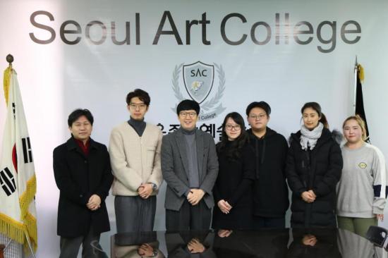 (从左至右:韩国SAC艺术中心院长孫大願、SAC学校理事金泰亨、SAC学校创立者金旼成、数字媒体艺术专业主任陈如华、工作室骨干教师侯博奡、SAC学校教授金效演、中韩翻译员安美燕)