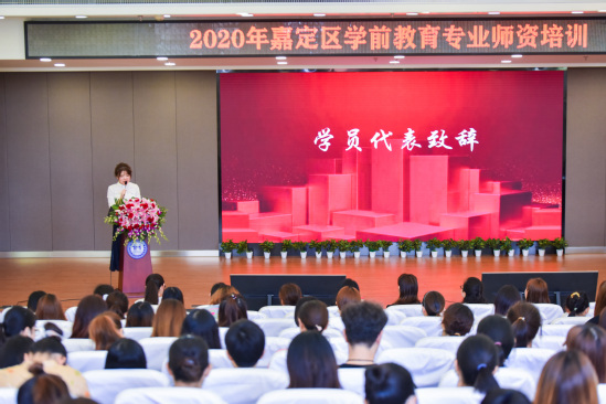 新城实验幼儿园的刘梦莹老师,代表全体学员发表了讲话。讲话中,对研修班的课程充满了期待,表达了要认真参加培训、遵守各项纪律的决心。对嘉定区教育局和天华学院提供的学习机会,也表达了感激之情。