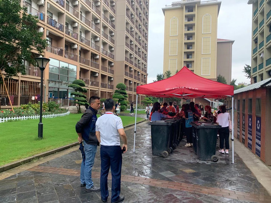 为确保我校垃圾分类工作有效推进,后勤管理部门冯建刚老师、学保处副处长邵海波老师以及综治办全体成员进行现场协调沟通,对每位同学垃圾分类规范进行引导。