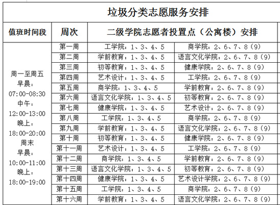 在志愿者与宿管人员的相互配合以及同学们的共同参与下,我校开学以来第一周垃圾分类工作开展取得显著效果。此次垃圾分类活动中,二级学院党总支书记、志愿者指导老师均定时到现场与志愿者进行沟通指导,加快完善学校生活垃圾分类定时、定点投放实施体系,推进了长效的生态文明绿色发展宣传机制,逐步建立起校园生活垃圾分类定时、定点投放的常态化、长效化,建设绿色、美丽的校园。