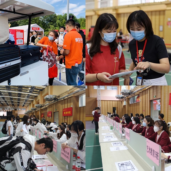 体育馆内各学院的迎新台,由班助理和辅导员进行现场电子办公,以便新生更快地完成登记、注册、缴费、安排寝室等报到事宜;家长休息区、吸烟区、行李寄存处、免费饮水等服务应有尽有;校园不间断的迎新短驳车、热情洋溢来回穿梭的志愿者、富有人文情怀的宣传展示、清晰的路标指示牌、维持秩序的工作人员,使2020级学生及家长感到既亲切又温暖。