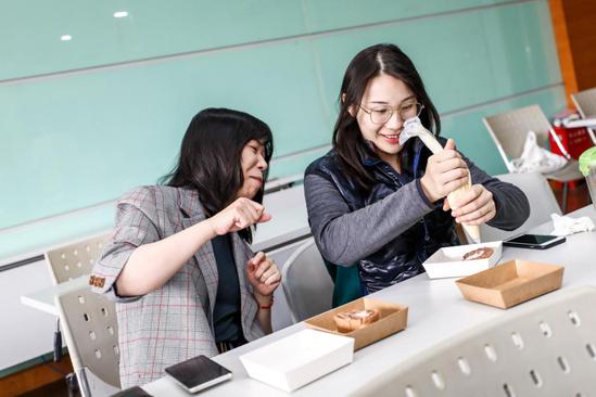 在周老师的悉心指导下,大家跃跃欲试,搅拌材料、裱花、撒可可粉,用自己的巧手装点出了花色不一,有颜又有料的美味点心。不难看出,我们的教师群体中不乏美食制作达人,完成的爆浆小蛋糕不仅味美,形态也非常的精致,直击视觉体验。