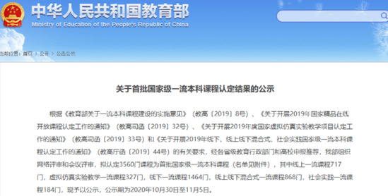 一流课程建设是教育部“双万计划”的重要组成部分,2019年教育部启动一流本科课程建设工作,计划经过三年左右的时间,建成万门左右国家级一流本科课程和万门左右省级一流课程。根据《教育部关于一流本科课程建设的实施意见》(教高〔2019〕8号)的有关要求,首批入选的国家级一流本科课程要求质量高、共享范围广、应用效果好、示范性强,并能够代表我国当前本科课程的最高水平。