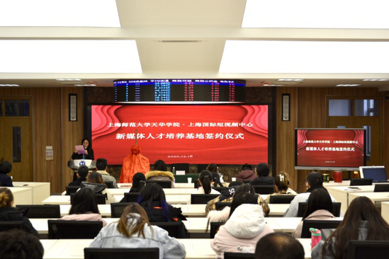 2020年12月18日下午,我校与上海国际短视频中心新媒体人才培养基地签约揭牌仪式在日华楼101商务实训室隆重举行,此次签约仪式主要由商学院牵头举办。出席此次签约仪式的领导和嘉宾有:商学院院长程葆青,上海国际短视频中心执行总裁丁嘉源,芦鸣公司人事总监夏玉春,商策公司人事总监宋佳,互联网营销业务培训师李倞,商学院旅游管理专业、国际商务专业部分教师和高年级学生参与了此次活动,签约仪式由旅游管理专业主任郭家秀主持。