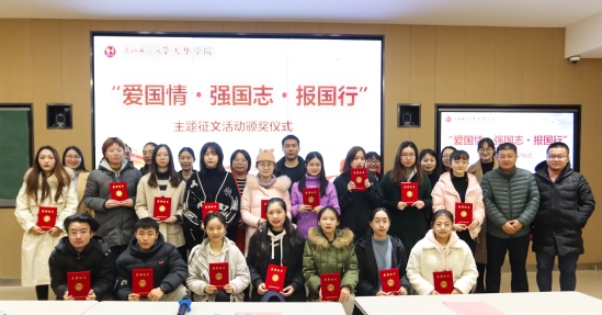 为大力弘扬爱国主义精神,激发青年学生把爱国情、强国志、报国行的精神自觉融入坚持和发展中国特色社会主义事业、建设社会主义现代化强国、实现中华民族伟大复兴的奋斗之中,今年10月初,校党委组织部、马克思主义学院、学保处共同举办了“爱国情、强国志、报国行”主题征文活动。12月22日中午,校党委组织部部长、马克思主义学院院长周凯波,校学保处常务副处长包静波,马克思主义学院副院长丁彩霞,以及全体马院教师为获奖同学举办了颁奖仪式。在历时两个月的活动中,共计收到来自7个二级学院150名学生的参赛文章。经过层层挑选,最终20名同学的文章脱颖而出。