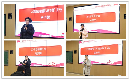 首先,丁彩霞院长宣读了此次活动的获奖学生名单,并鼓励各位同学继续参与更多的活动表达爱国情义,展示自我风采。此次颁奖仪式中,四名学生代表分享了自己的写作思路和心得体会。第一名学生是来自艺术设计学院20级影视摄影与制作1班的李何超同学,他从一张小小的“台胞证”的变化中,感叹祖国的日益开放和发展。第二名学生是来自商学院18级财务管理的王莘怡同学,她认为国是千万家,家是最小国,她写作时从自己的家乡入手,从家乡道路、村民使用交通工具的变化等展现出祖国的日益富强。第三名学生是来自初等教育学院20级小学教育1班的陆彦卿同学,她的文章向“最可爱的人”抗美援朝志愿军战士致敬,她的父亲也是一名消防战士,自己励志要成为一名人民教师为祖国做贡献。第四名学生是来自学前教育学院18级学前教育中外合作1班的姚偌娴同学,她分享了自己外婆、二姨妈和姐姐三代航空人的故事,在“航天精神”的激励下,她们用一腔热情和实际行动体现了一个家庭对于祖国的热爱、对于祖国航天事业的奉献,对于提高祖国航天技术的决心。姚偌娴同学最后也表达她自己要成为一名合格的人民教师的志向,为祖国培养更多的人才。