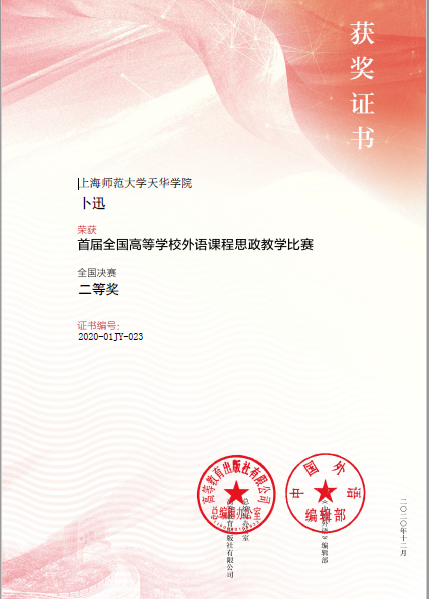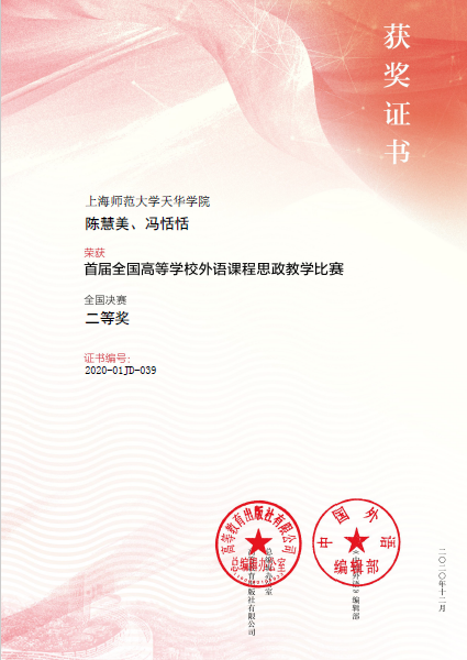 2020年12月19日,高等教育出版社与《中国外语》编辑部共同举办的“首届全国高等学校外语课程思政教学比赛”终于落下帷幕。我校初等教育学院英语专业卜迅老师(个人)和陈慧美、冯恬恬老师(团队)的教学设计经过层层选拔,从1500多项作品中脱颖而出,分获英语专业组二等奖和大学英语组全国二等奖。本次大赛获奖,体现了初等教育学院在推进外语课程思政建设方面的实力。