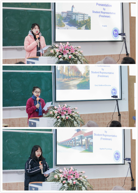 2020级各专业学生代表发言。学前教育专业时欣悦、英语专业宋艺佳、应用心理学专业刘佳彦用流利的英语向学校领导以及远在美国的北亚领导分享了自己入学以来的学习体验,以及中外合作教学给他们带来的深远影响,分享了自己对该专业特色的认识,以及对前往北亚利桑那大学学好专业知识为社会服务的决心。