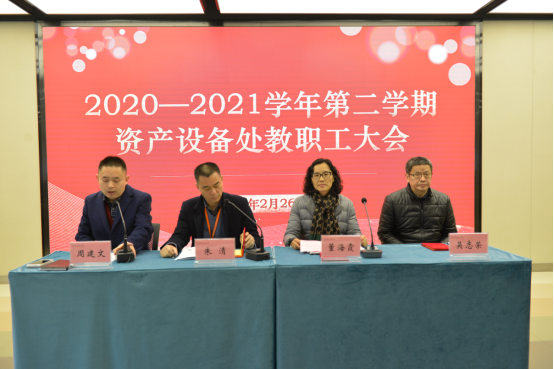 2021年2月26日下午13:00,资产设备处在图书馆报告厅召开新学期教职工大会,资产设备处处长朱清,副处长董海霞、周建文,图书馆馆长吴志荣,资产设备处全体教职工出席了大会。大会由资产设备处副处长周建文主持。