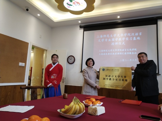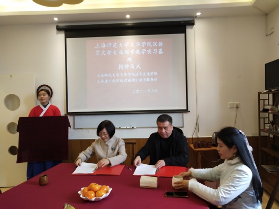 3月19日,我校语言文化学院院长陈再阳和上海浦东新区致君诵读汇读书服务社理事长殷雷签订了《关于上海师范大学天华学院语言文化学院在上海浦东新区致君诵读汇读书服务社设立汉语言文学专业国学教学实习基地的协议》,并举行了授牌仪式。我校语言文化学院直属党支部书记郭阿诺及上海浦东新区致君诵读汇读书服务社全体教职工出席。