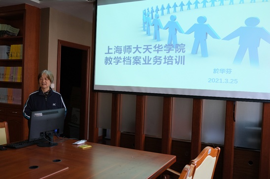 教学档案业务培训由於华芬老师主讲,分四个部分进行业务讲解和指导。於老师首先对进一步学习、宣传、贯彻、落实《档案法》进行了科普讲解;进而总结了教学档案归档工作中的主要成绩和短板;就2021年教学档案推进工作,要求各二级学院做到应收尽收,应归尽归,进一步推进档案数字化、信息化建设;最后,於老师就使用档案管理软件应注意的技术问题进行了说明。