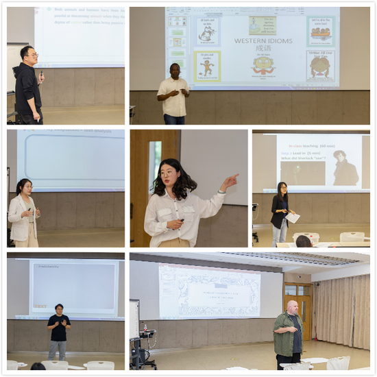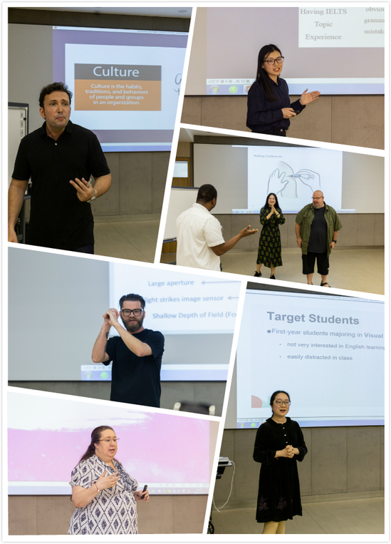 本次专题活动共有13位教师进行了现场教学展示,每位教师都各显其能,各展独技。结合学校目前实施的“线上线下混合式”教学模式,全体教师说课环节均展示了如何借助网络教育技术进行“课前-课中-课后”联动,教学设计完整。讲课环节中教教学中引入了国外先进的教学法,注重课堂互动与学习产出。比如,冯恬恬和王广华结合国外前沿教学理论分别将“6P”教学法和“TBL”(小组讨论教学法)引入课堂;赵旋通过别出心裁的互动游戏来凸显重点和难点。外教们课堂上更加富有活力和激情,能够抓住学生的注意力,Paul在课堂上慷慨激昂,Keegan在图片的选取和运用上技高一筹,Yolanda将学生作业与所学专业结合来激发学生的兴趣。