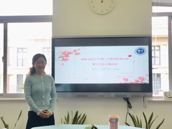 为帮助老师们更加充分地准备,国际部于4月29日邀请初等教育学院副院长、教学名师、全国青年教师教学大赛等多项比赛获得者胡玥博士为教师们做专题讲座进行辅导。讲座中胡玥以自己参加教学比赛的切身感受和心得为切入点,娓娓道来,对教师们提出了三点教学建议和忠告:“课件打磨无止境”、“文本深究是关键”、“随机应变是诀窍”,言简意赅,便于识记。通过本次讲座,各青年教师都获益匪浅,并活学活用到了教学展示中。