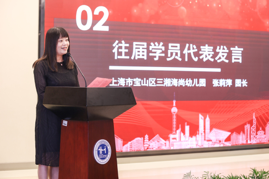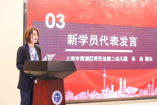 第五期骨干园长班学员,黄浦区荷花池第二幼儿园园长乐洛代表新学员发言,感谢上海市教委和天华学院给予一个优质、高端、国际化的学习平台。当前正值党的百年华诞,园长们将以不忘初心的执着和坚守,坚持对学前教育的热爱,坚持以儿童发展为本的理念,坚持尊重教育的科学规律,拓展视野,提高展位,树立新思维,践行新理念。