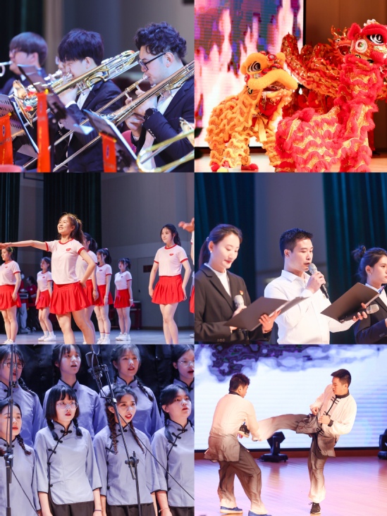活动第二阶段为校团委准备的“情系天华发展,共庆建党百年”文艺汇演,艺术设计学院辅导员陆湲湲、2017届毕业生陈玉枫担任主持。舞龙、舞狮、川剧变脸、武术拳操齐齐上阵,展现了天华学子斗志昂扬的精神面貌;师生朗诵、合唱、歌舞节目展示了活力天华建设的成果,表达了歌颂天华、回忆母校点滴生活的情感。这一个个精心打造的节目唤起了所有天华人的共同记忆,也激起了一阵又一阵热烈的掌声。节目视频背景里熟悉的天华场景,那当年的你我他,引起台上台下的广泛共鸣。不少校友在活动结束后心潮澎湃,热泪盈眶,纷纷感慨学校建设发展速度之快,校园文化活动的丰富多彩。