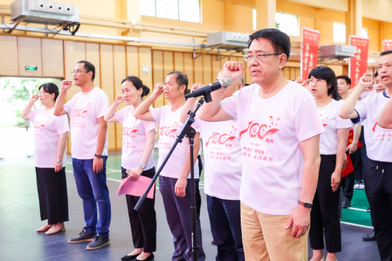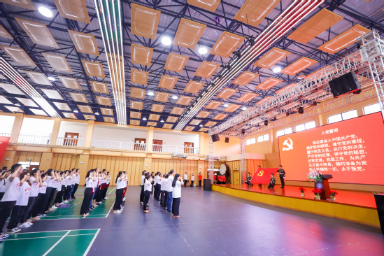 “我志愿加入中国共产党,拥护党的纲领,遵守党的章程,履行党员义务……随时准备为党和人民牺牲一切,永不叛党。”在党委书记陆建非的领誓下,学校新发展党员面向鲜红的中国共产党党旗进行了入党宣誓,老党员们也一同举起右拳,重温入党誓词,铿锵有力的誓言声响彻体育馆。