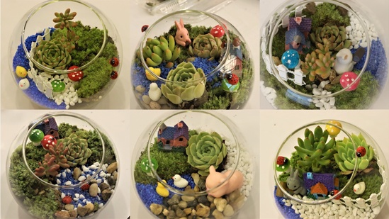 听着讲解,老师们迫不及待地投入多肉植物微景观的创作之中。大家在花艺师的带领下,先在脑海里构想作品主题、设计微景观整体布局,然后将绿植、苔藓、沙石依次摆进玻璃容器里,再结合自己的想象和创意,利用小配饰来丰富画面、突显自己的设计特色,最终制作出一个个独一无二、风格迥异的微景观作品。