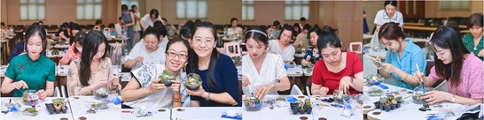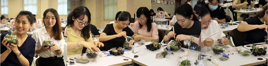 活动开始,花艺师简要介绍了常见微景观的组成、设计原则及养护方法,一边讲解,一边为老师们进行细致的示范指导,并且启发大家想象设计微景观下的和谐、美好意境。