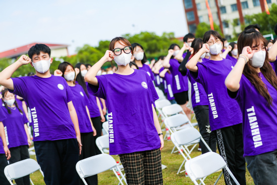 开学典礼最后,全体2021级新生在校团委书记杨央的带领下宣誓,以青春的名义,秉承“为做人而学习”的校训精神,铭记“诚信与责任”的教育理念,不忘信守诺言、不忘对人友善、不忘父母养育、不忘报效祖国,争做“专、通、雅”协调发展的天华人。