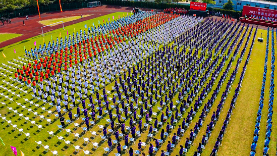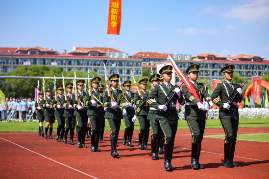 伴随着交响管乐团激昂的乐曲声,国旗护卫队迈着铿锵有力的步伐,昂首阔步迈向升旗台,数千名师生整齐列队行注目礼。升国旗、奏唱国歌,开学典礼在庄严的国歌声中拉开帷幕。