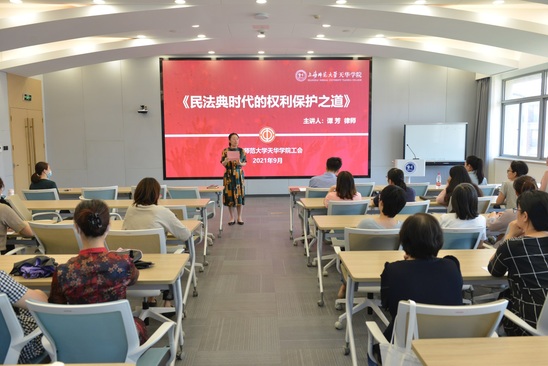 为深入学习宣传习近平法治思想,进一步做好法治宣传教育工作,充分认识颁布实施民法典重大意义,切实依法保障人民合法权益,校妇工委在9月17日中午,特别邀请中华全国律师协会婚姻家庭法委员会副主任、第十二次全国妇女代表大会代表、上海市妇联执委、“全国三八红旗手”获得者谭芳律师,在明华楼5楼远程教学中心开展以《民法典时代的权利保护之道》为专题的法律知识讲座,本次活动由工会常务副主席曹卫主持。