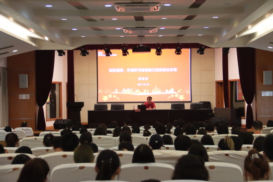 2021年9月29日下午16:00,本学期首期“心灵之灯”系列讲座之《如影随形,外语学习教育助力党的诞生发展》在明华楼报告厅由校党委书记陆建非教授正式开讲。学保处助理以上干部、各二级学院党总支书记、全体正副辅导员以及200余名学生聆听了此次讲座。本次讲座由学保处副处长兼校团委书记杨央主持。