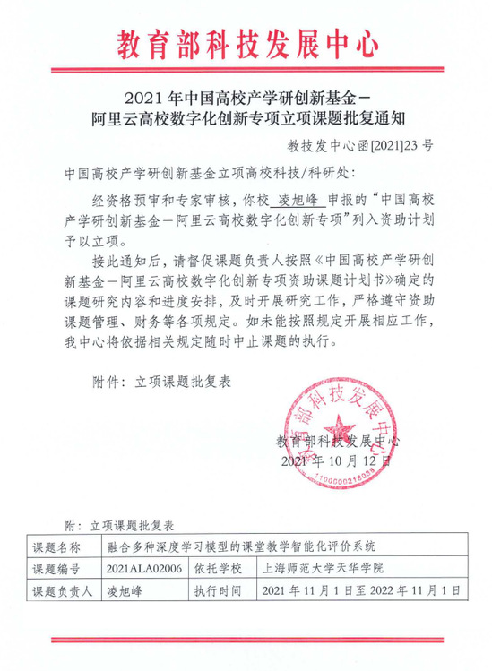 近日,教育部科技发展中心发布通知,经资格预审和专家审核,我校人工智能学院院长凌旭峰申报的“中国高校产学研创新基金一阿里云高校数字化创新专项”成功立项。本次立项的课题名称为“融合多种深度学习模型的课堂教学智能化评价系统”。